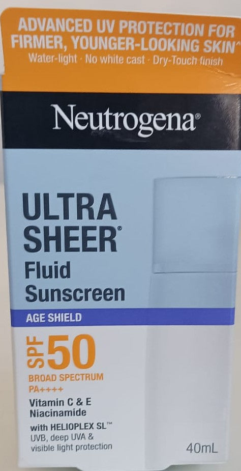 Neutrogena Ultra Sheer Fluid Sunscreen Age Shield is a daily sunscreen that goes beyond UV protection. Enriched with antioxidants Vitamin C & E, Niacinamide and Hyaluronic Acid, it helps combats signed of premature aging caused by sun exposure and environmental agrressors with regular use. Dermatologically-tested, Neutrogena® Ultra Sheer® FluidSunscreen Age Shield® is a daily sunscreen that goes beyond UVprotection. Enriched with antioxidants Vitamin C E, Niacinamideand Hyaluronic Acid, it helps combat signs of premature agingcaused by sun exposure and environmental aggressors with regularuse. Powered with Helioplex SL® Technology, it delivers highbroad-spectrum UVA and UVB protection.Dark spots, dullness and uneven skin tone are visibly reduced tounveil a brighter and radiant complexion.Helioplex SL® Technology use efficient UV filters to forma protective layer on the skin’s surface, for highprotection against UVA and UVB.Water-light texture in an invisible dry-touch finish,leaves no white cast.Suitable for all skin types, including sensitive skin. Contains Vitamin C&E, Niacinamide and Hyaluronic Acid • Invisible dry touch finish