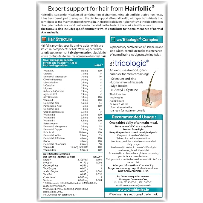 Packed with 27 bio- nutrients: Wellman Hairfollic is a comprehensive blend of nutrients designed specifically for men, including selenium, zinc, vitamin C, vitamin B3, copper, and Tricologic Amino Lignan Complex, to promote healthy hair, beard, and skin.