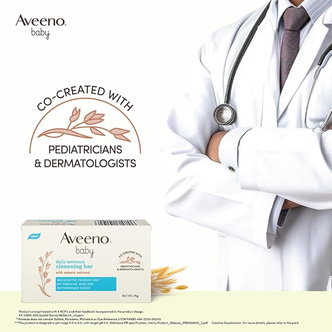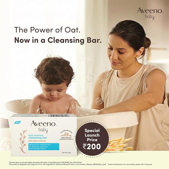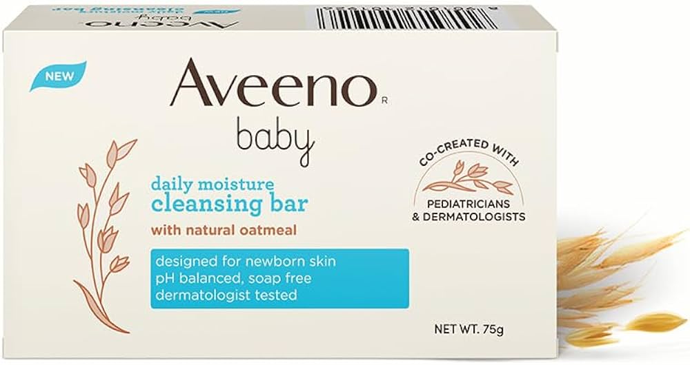 Gentle Care for Your Baby’s Sensitive Skin Specially designed for newborns and babies with sensitive skin, the Aveeno Baby Daily Moisture Cleansing Bar 75g offers a gentle, nourishing cleanse with every bath. Formulated with natural Oatmeal, Glycerin and Shea Butter, it helps maintain the skin’s moisture barrier while leaving it feeling soft and smooth. Co-created with Pediatricians and Dermatologists, this pH-balanced cleansing bar is soap-free and free of parabens, sulfates, and phthalates—making it safe and soothing for delicate baby skin. At Aveeno Baby, we use high quality, natural oats and carefully harvest their moisturizing and soothing properties. For complete bathing regime, use daily with Aveeno Baby Daily Moisture Lotion to gently cleanse while locking in essential moisture. Directions for Use: Lather on your hand & then gently apply on your baby's body. Rinse off with lukewarm water